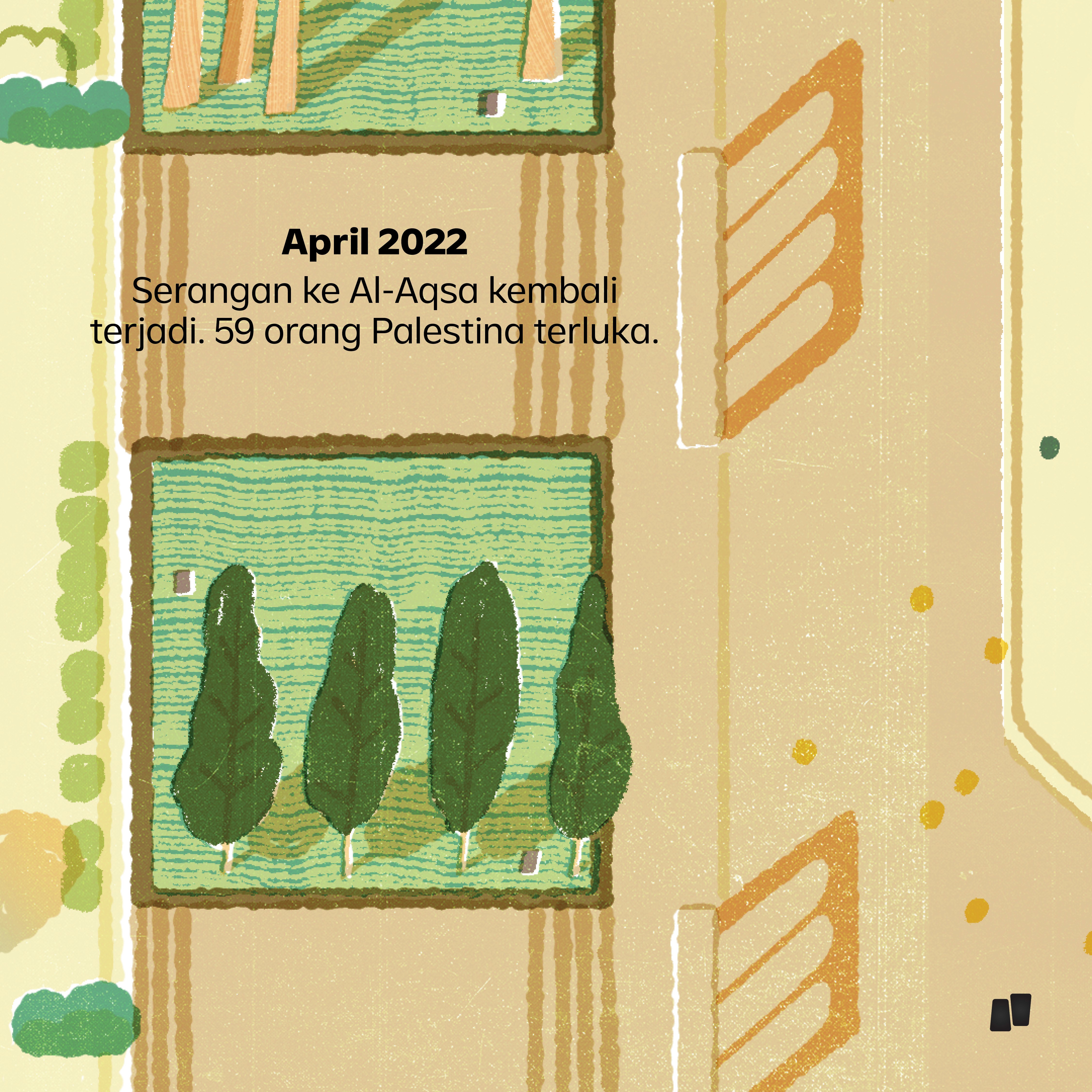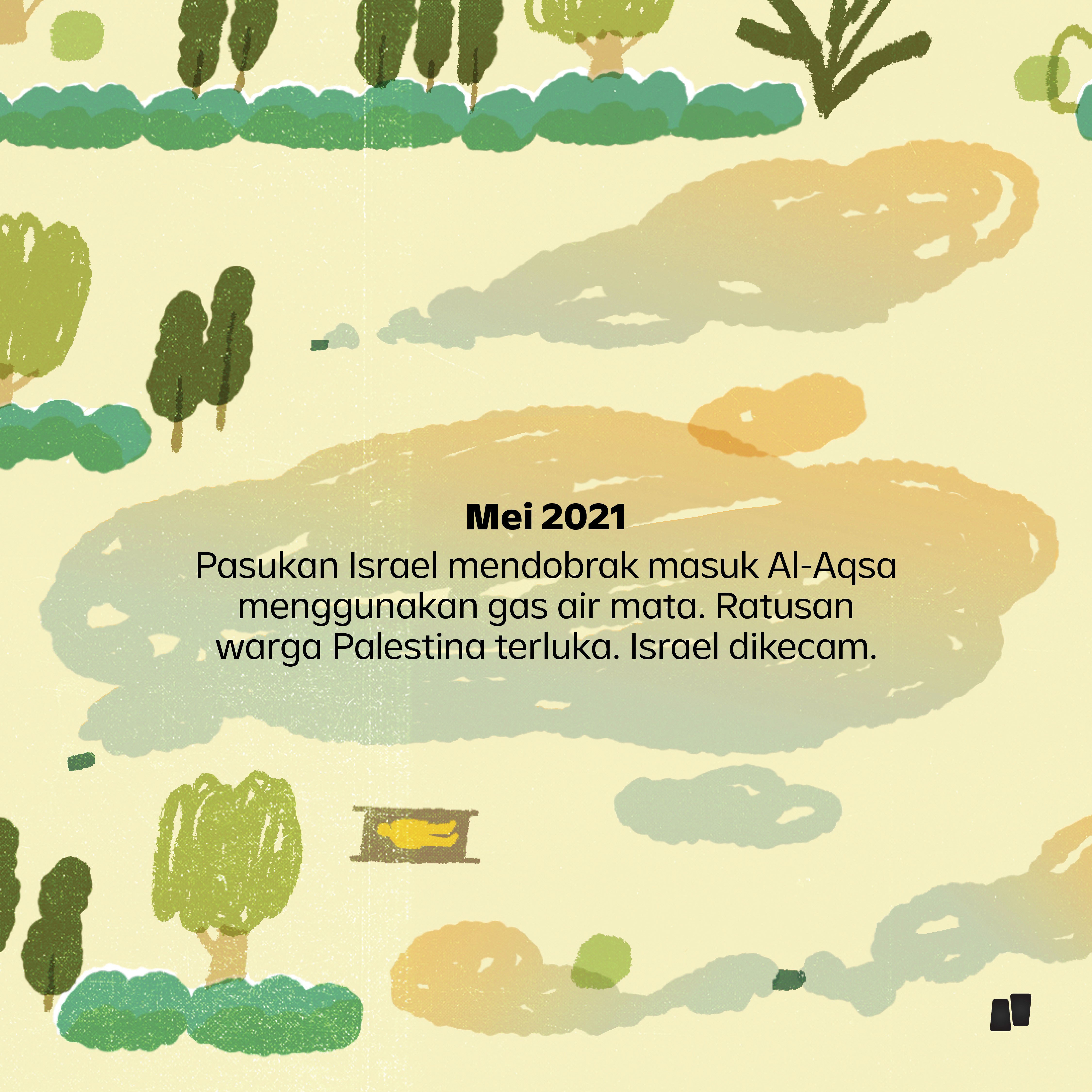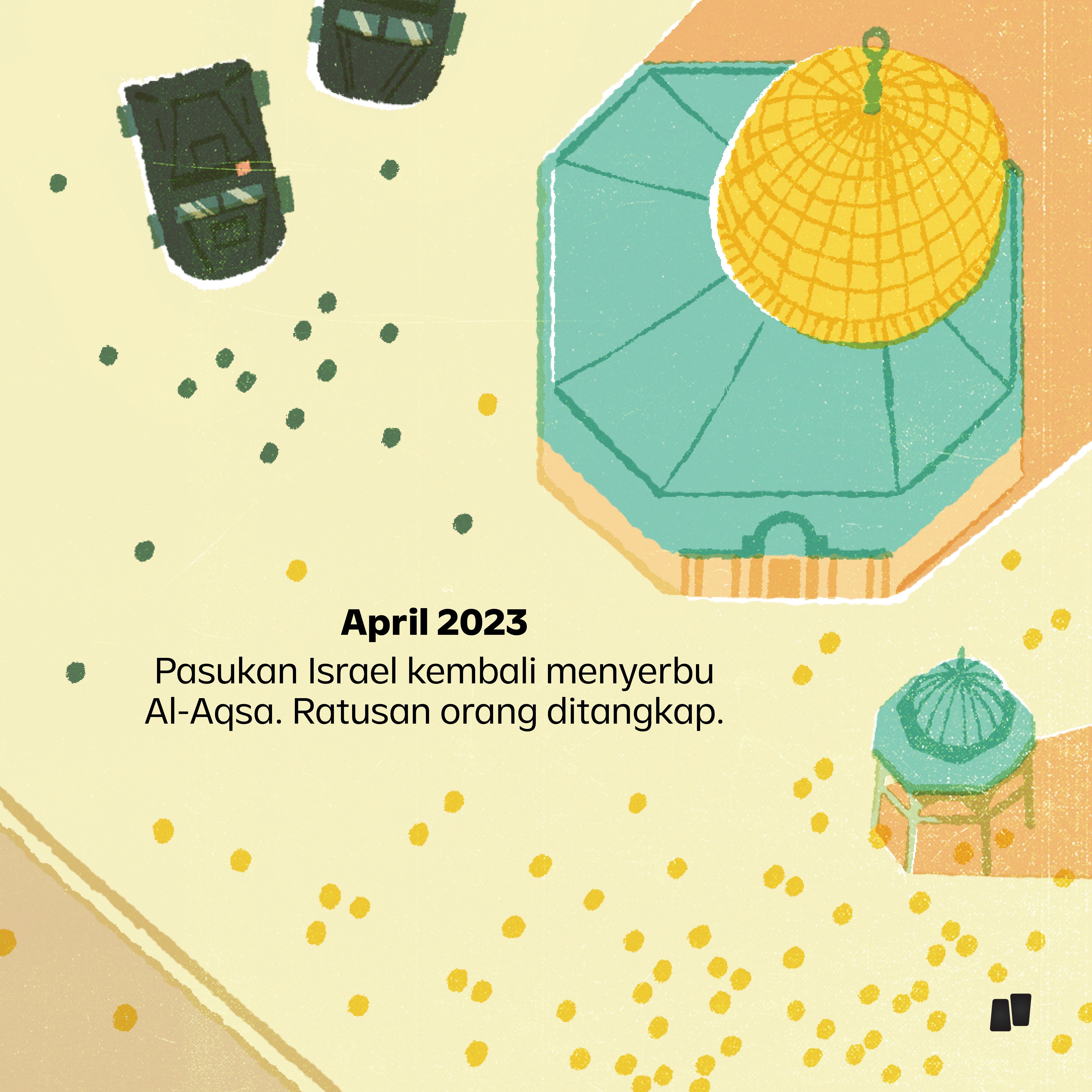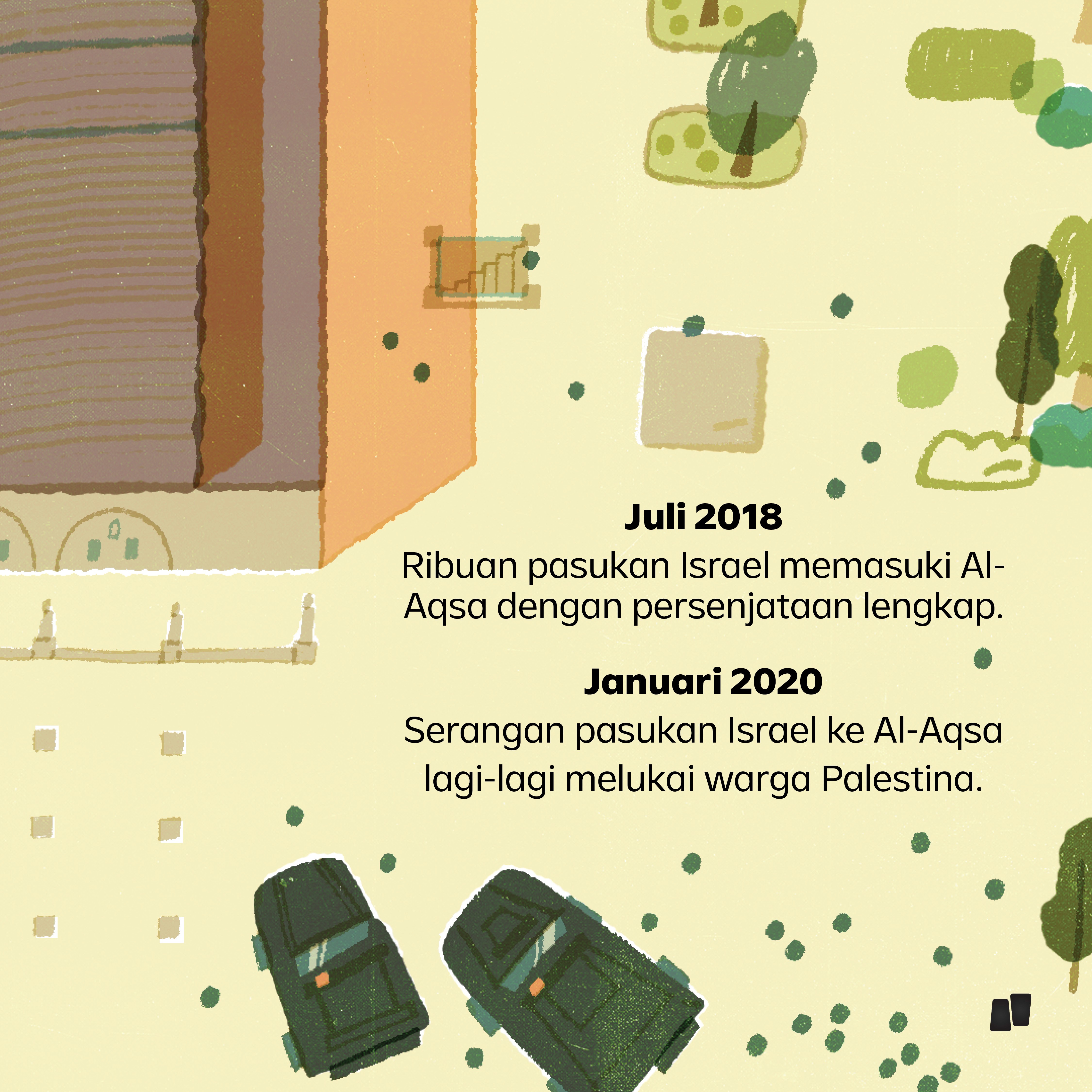 An illustrated timeline documenting incidents of violence against Muslims at Al-Aqsa Mosque.