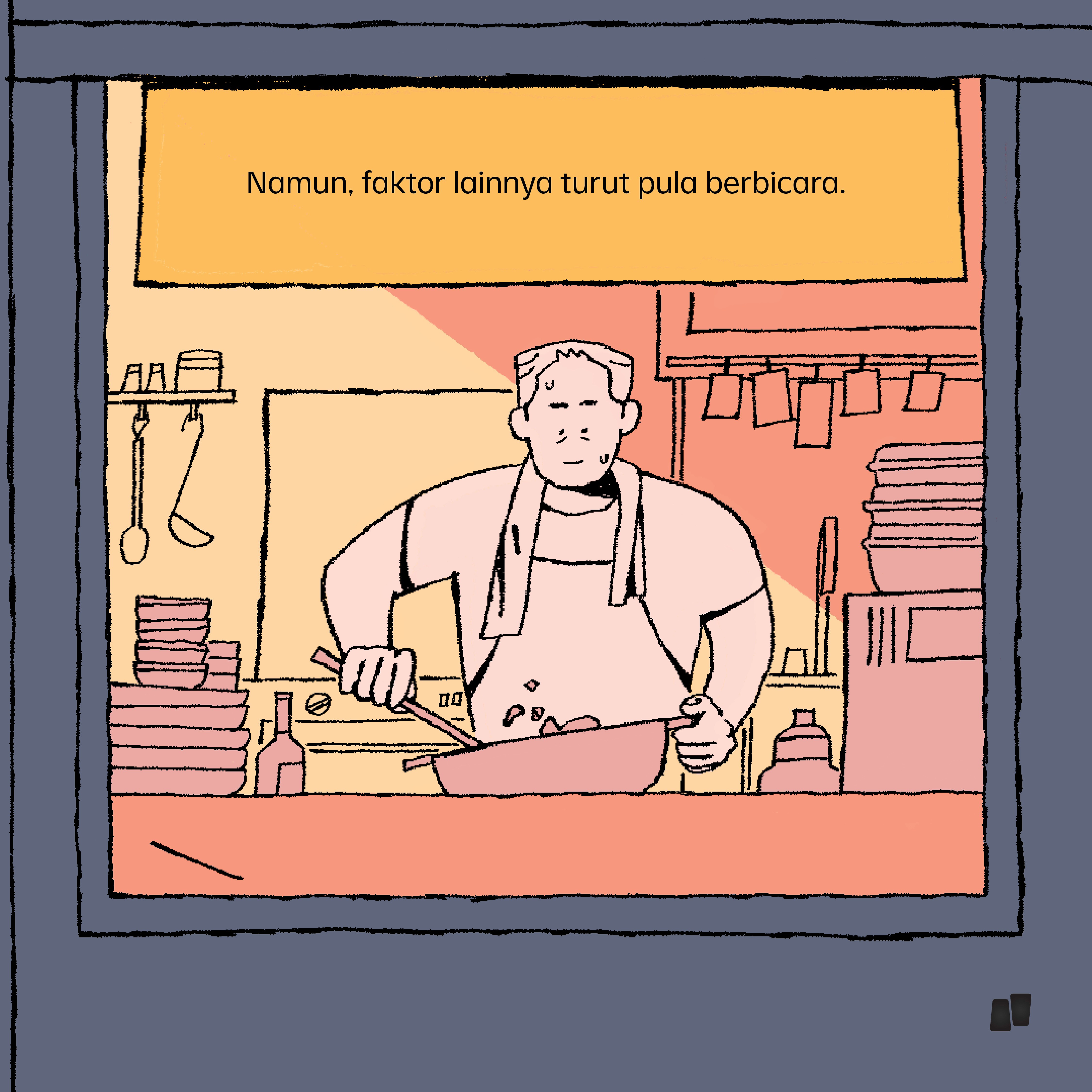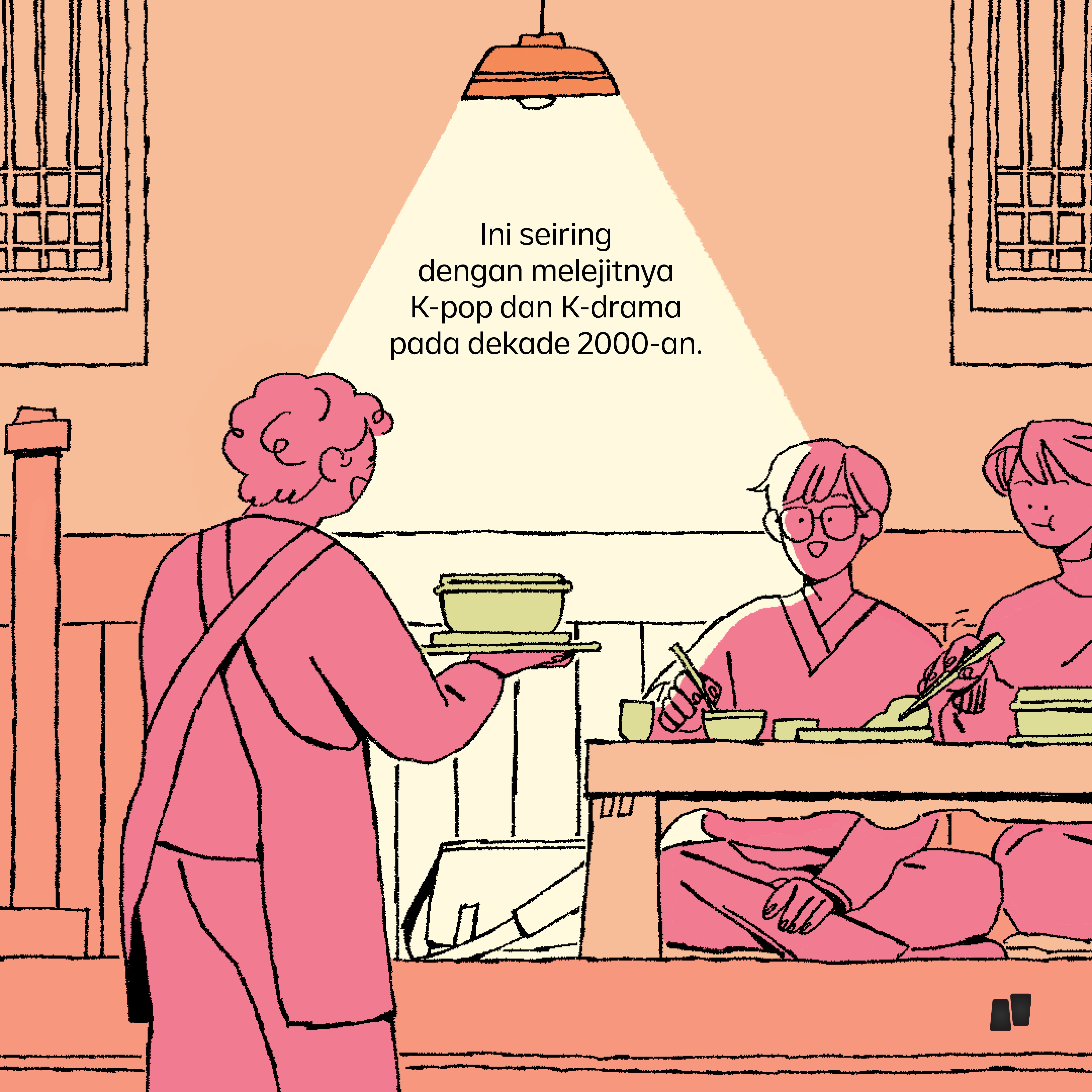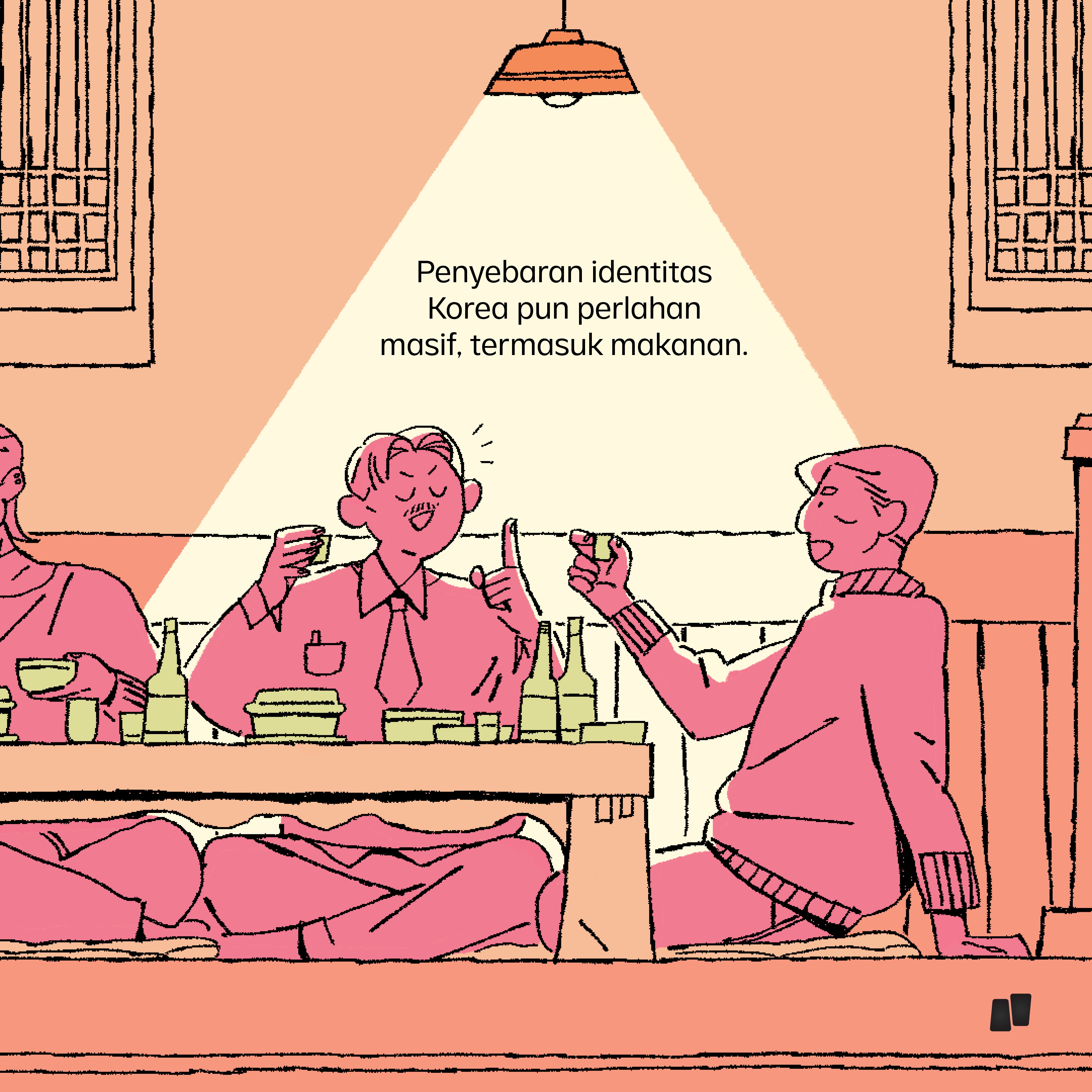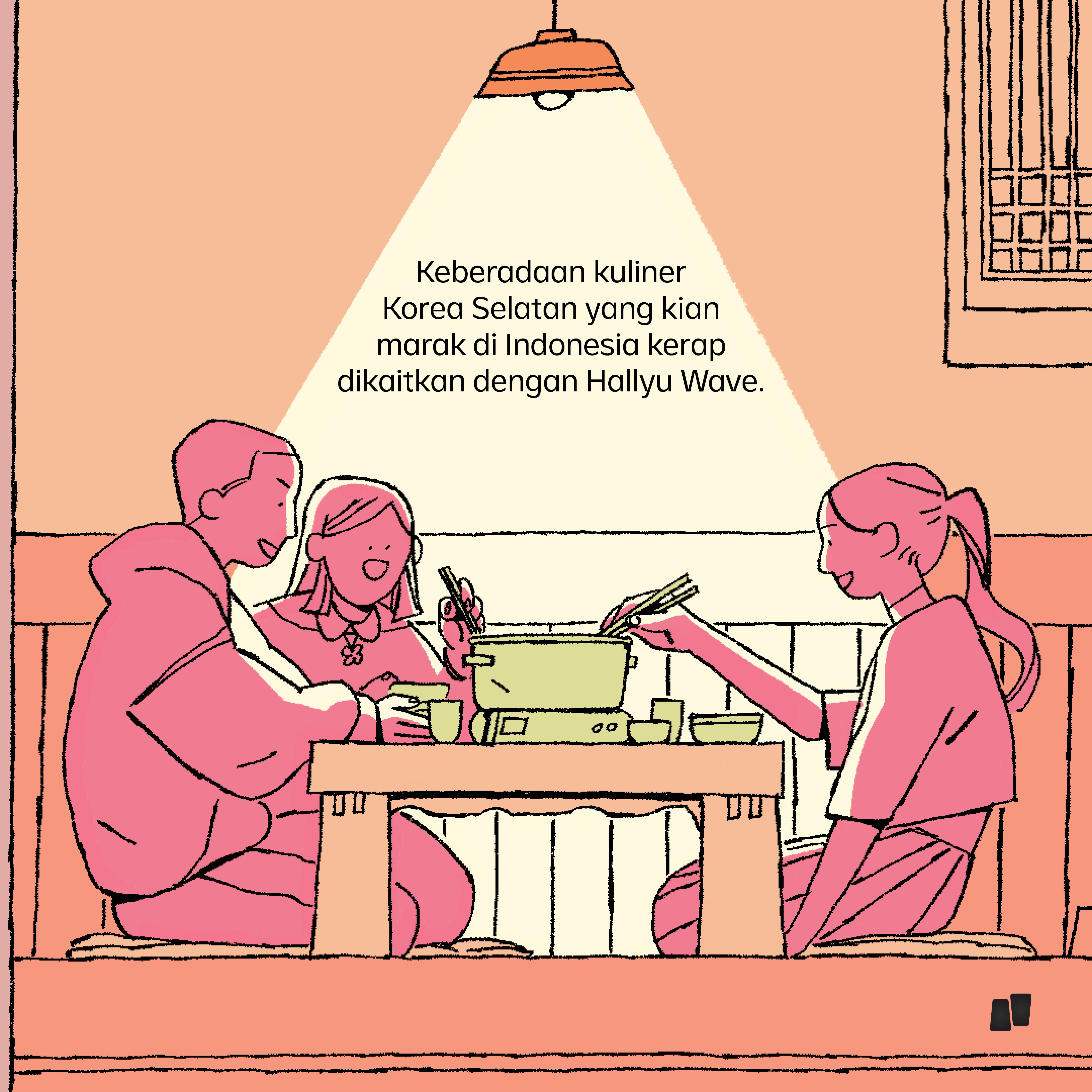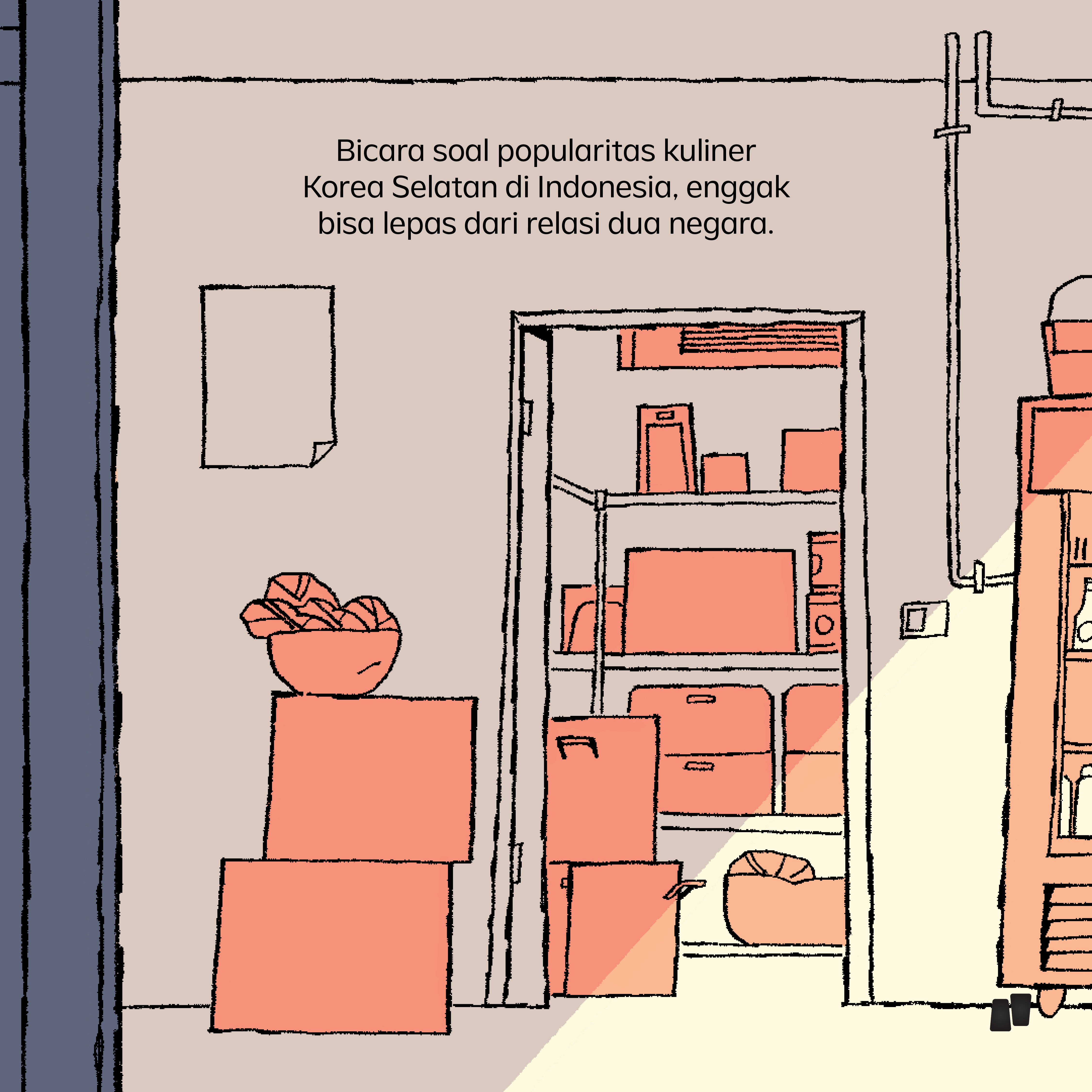 A multi-slide illustration exploring why Korean cuisine gained popularity in Indonesia.
